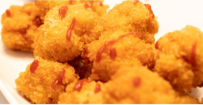 - Coat mac and cheese balls with flour, then egg wash and finish off with Panko.